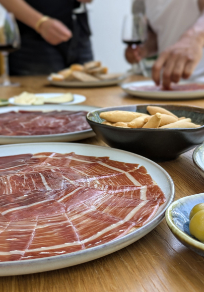 Jamón ibérico de bellota: a tölgyesek szabad legelőin tartott ibériai sertéshús, tengeri só.