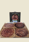 Degusztációs ajándékcsomag kézzel szeletelt ibériai jamónból és lomóból: jamón ibérico de cebo, jamón ibérico de cebo de campo, jamón ibérico de bellota és lomo ibérico de cebo. Kémiai tartósítószerek nélkül.